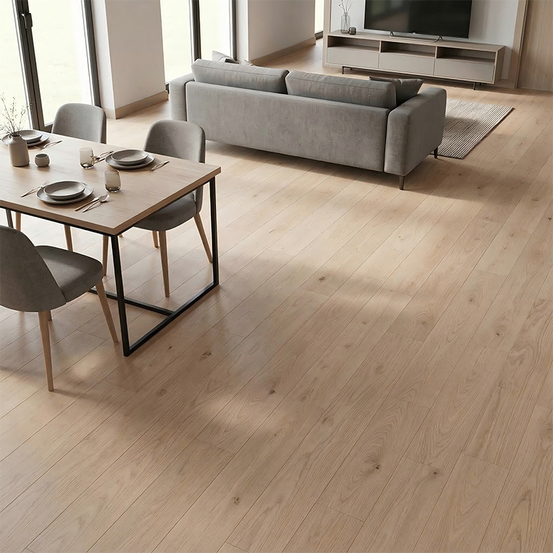 The surface UV coating is smooth and dense. It can be easily cleaned with a dry mop for daily care, and any crevices in the texture can be gently brushed with a soft brush. It does not tend to trap dirt or grime.