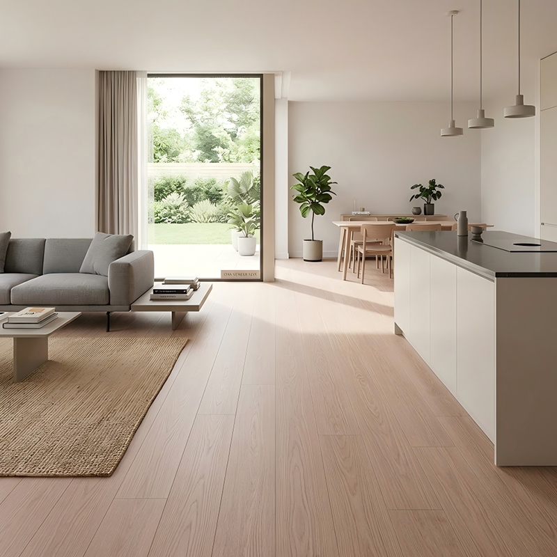 The surface UV coating is smooth and dense. It can be easily cleaned with a dry mop for daily care, and any crevices in the texture can be gently brushed with a soft brush. It does not tend to trap dirt or grime.