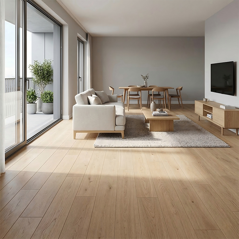 The surface UV coating is smooth and dense. It can be easily cleaned with a dry mop for daily care, and any crevices in the texture can be gently brushed with a soft brush. It does not tend to trap dirt or grime.