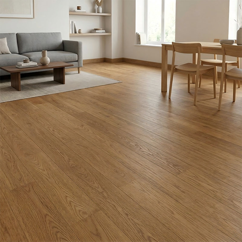 The surface UV coating is smooth and dense. It can be easily cleaned with a dry mop for daily care, and any crevices in the texture can be gently brushed with a soft brush. It does not tend to trap dirt or grime.