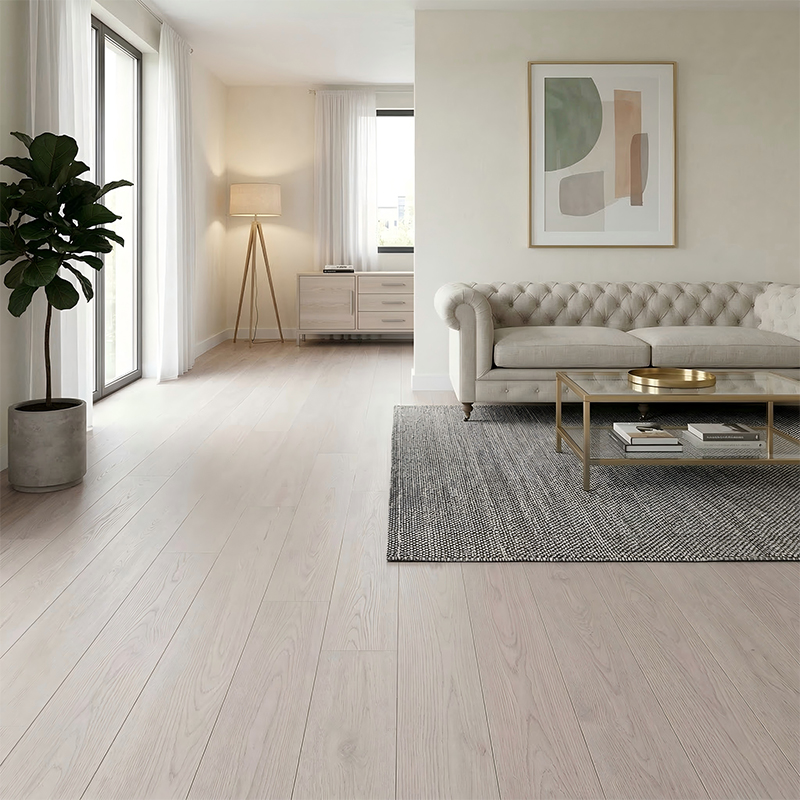 The surface UV coating is smooth and dense. It can be easily cleaned with a dry mop for daily care, and any crevices in the texture can be gently brushed with a soft brush. It does not tend to trap dirt or grime.
