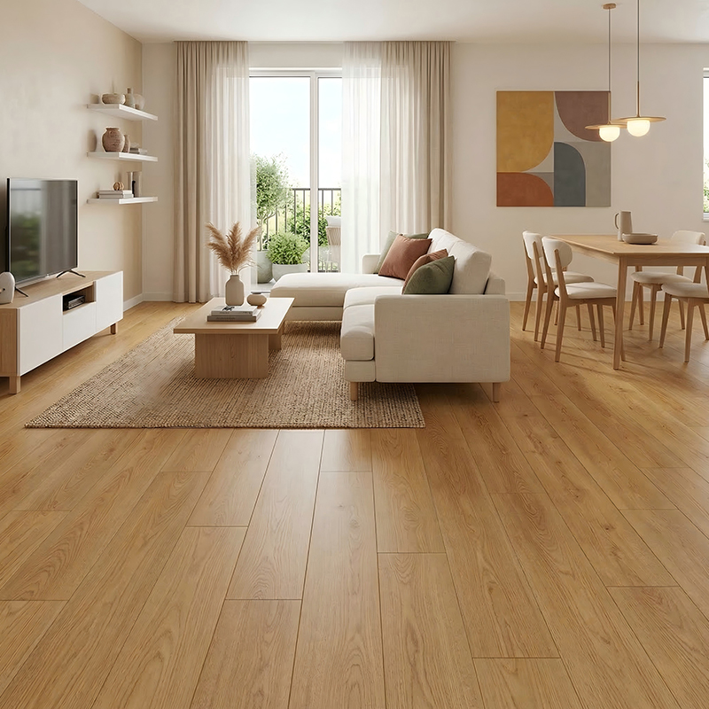 The surface UV coating is smooth and dense. It can be easily cleaned with a dry mop for daily care, and any crevices in the texture can be gently brushed with a soft brush. It does not tend to trap dirt or grime.