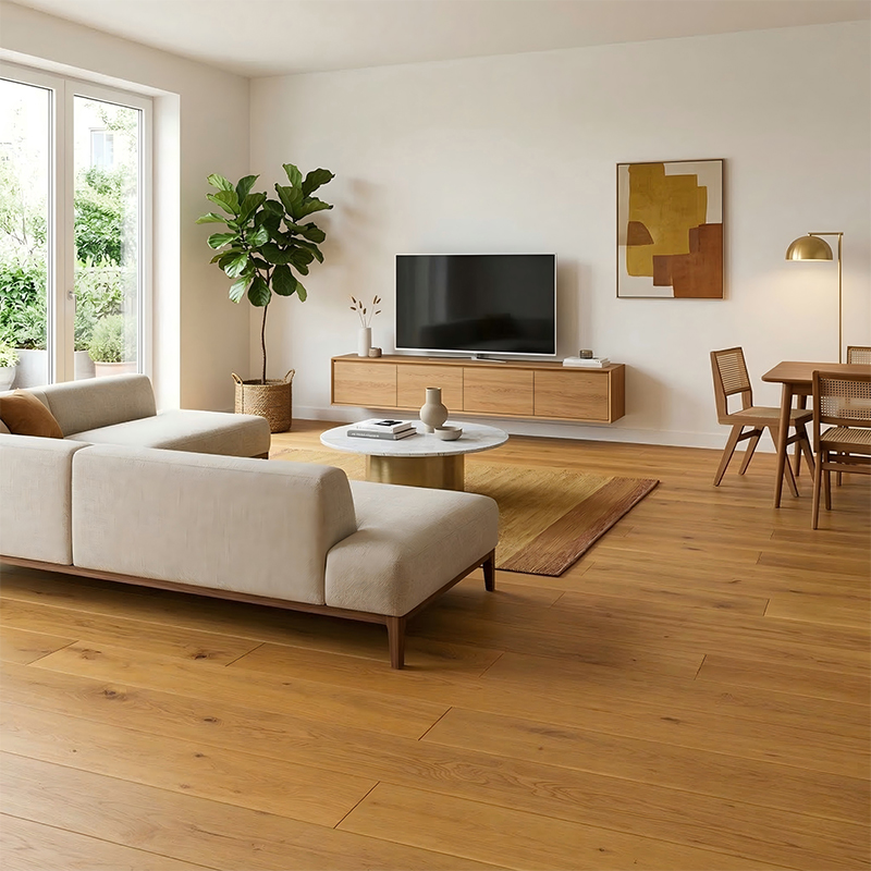 The surface UV coating is smooth and dense. It can be easily cleaned with a dry mop for daily care, and any crevices in the texture can be gently brushed with a soft brush. It does not tend to trap dirt or grime.