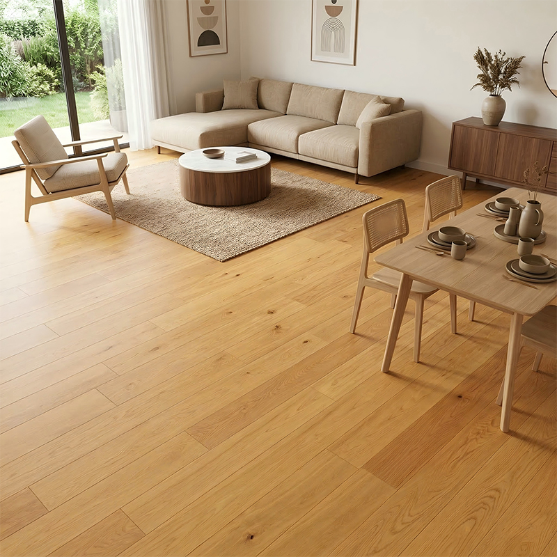 The surface UV coating is smooth and dense. It can be easily cleaned with a dry mop for daily care, and any crevices in the texture can be gently brushed with a soft brush. It does not tend to trap dirt or grime.
